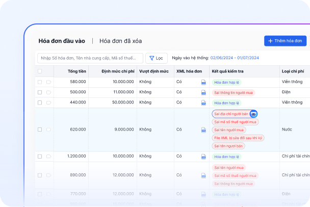 Kiểm tra hóa đơn tự động: AI kiểm tra tiêu chí hợp lệ, thuế suất, ngành nghề, địa điểm hoạt động và cảnh báo để con người ra quyết định xử lý