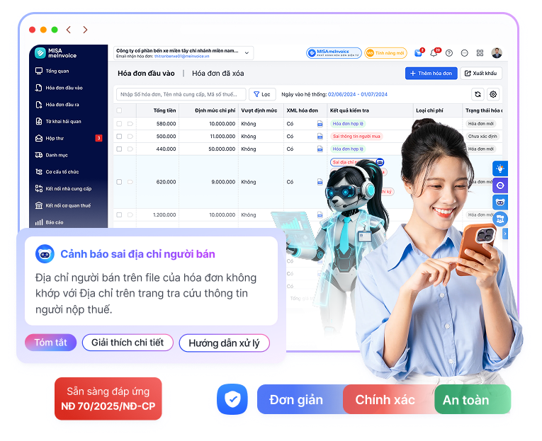 AI trong meInvoice hỗ trợ các tác vụ như kiểm tra tính hợp lệ hóa đơn, phân loại chi phí, phát hiện rủi ro và bất thường. Con người trực tiếp xử lý nghiệp vụ, giám sát, phê duyệt và ra quyết định quan trọng