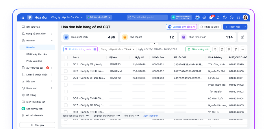 Doanh nghiệp sử dụng MISA meInvoice để phát hành và quản lý hóa đơn điện tử, hóa đơn máy tính tiền đúng chuẩn pháp lý. Đây là nền tảng dữ liệu tập trung để AI hoạt động hiệu quả